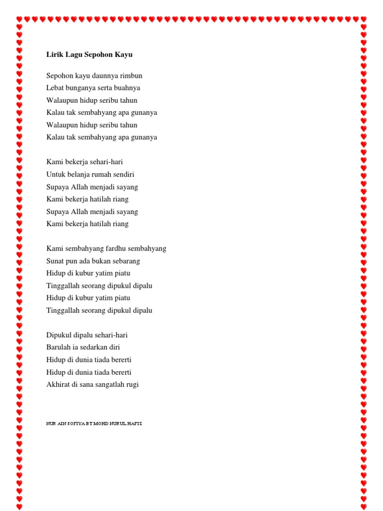. Lirik Lagu Sepohon Kayu Nur Ain Sofiya Bt Mohd Nurul Hafiz. Berikut ini adalah Lirik Lagu Sepohon Kayu yang dipopulerkan oleh Aishwa Nahla Karnadi. Sepohon Kayu Lagu Tersyahdu Lirik Youtube.