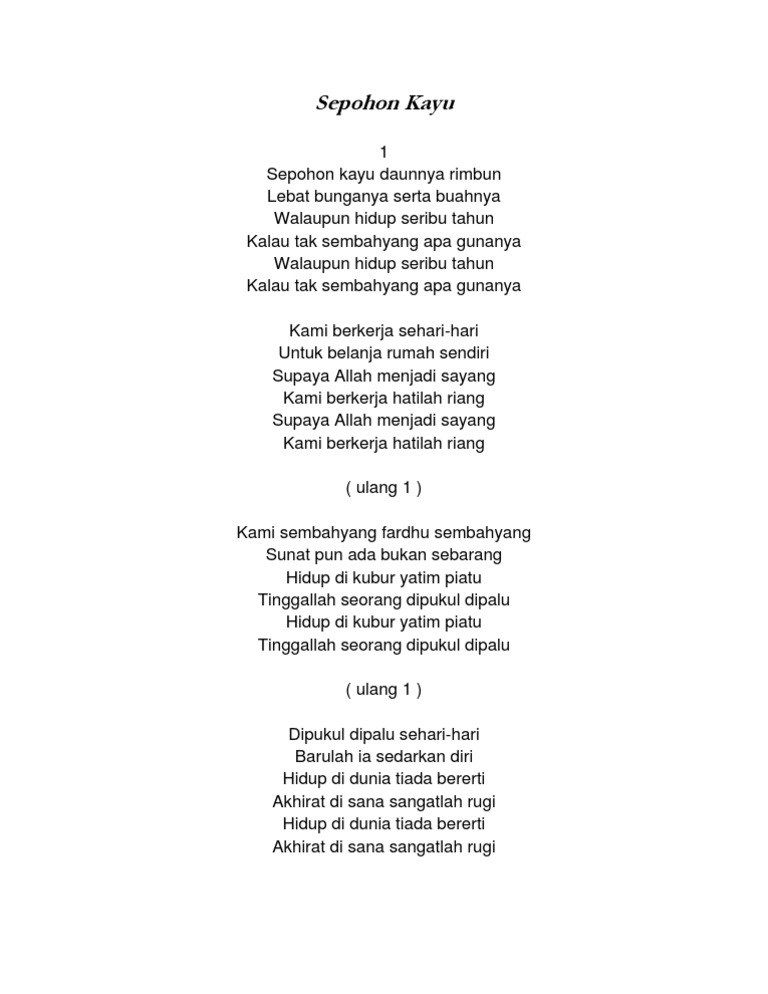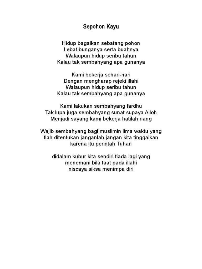 Sepohon kayu daunnya rimbun Lebat bunganya serta buahnya Walaupun hidup seribu tahun Kalau tak sembahyang apa gunanya Kami bekerja sehari-hari Untuk belanja rumah sendiri Walaupun hidup seribu tahun Kalau tak sembahyang apa gunanya Kami sembahyang fardu sembahyang Sunatpun ada bukan sembarang Supaya Allah menjadi sayang Kami bekerja. Mari kita bersenandung lagu religi islami yang berjudul sepohon kayu.